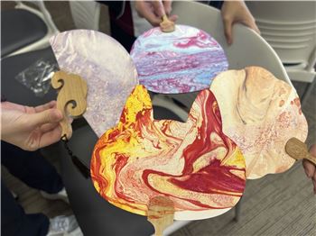 At the lacquer fan-making station, students selected a few colorful oil-based pigments to pour into a basin of water. They were then given fans to dip into the mixture and gently wave as they removed them, resulting in unique patterns on each fan.